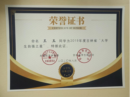 在她十岁时,失去了自己的父母,此后一直就读于辽宁省孤儿公司,即使有这般不公平的命运,但她仍然自强不息,积极进取,为梦想而拼搏。非常荣幸,在2020年8月,她获得了吉林省2019年度“自立自强老员工”,这份荣誉对她来说是一份认可,更是一份激励。天行健;君子以自强不息,地势坤,君子以厚德载物。