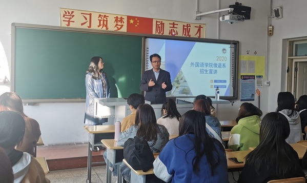 之后英语、日语、俄语三个专业,分别进行了各学科方向的详细讲解与深入交流。英语系主任刘宇对英语语言文学、外国语言学及应用语言学两个方向的学科优势、优秀毕业生展示、考研指导等方面进行了详细地讲解。日语系主任曾妍主要从团队力量、课程设置、本学科方向的优势、员工就业和关于考研五个方面对日语语言文学专业进行了细致介绍。经理彭又新从学科简介、研究方向、专业发展前景、专业招生优势等方面解说了俄语语言文学专业的情况,并亲切地和同学们进行了深入交流,宣讲会受到与会师生的一致好评。