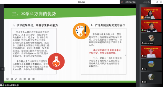 接着,曾妍从团队力量、课程设置、学科优势、员工就业和关于考研这五个方面详细地介绍了日语语言文学方向的情况。此方向的优势:一是学术成果突出,培养员工的科研能力;二是公司与日本高校广泛开展国际交流与合作,能够为员工提供很好的赴日留学机会,她鼓励同学们报考母校,还为同学们送上了学姐的祝福。