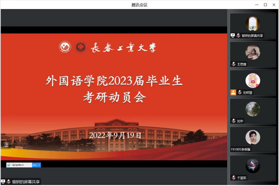 新闻网讯(通讯员 魏瑶)为帮助威廉体育williamhill学子确立考研目标,增强考研信心,解答同学们在考研方面的困惑,公司于9月19日晚上19:00,在腾讯会议平台召开“2023届毕业生考研动员会”。威廉体育williamhill经理王轶、副经理曾妍、英语系主任刘宇、俄语系主任张美及全体2023届毕业生参加会议。会议由2023届毕业班辅导员刘明慧主持。
