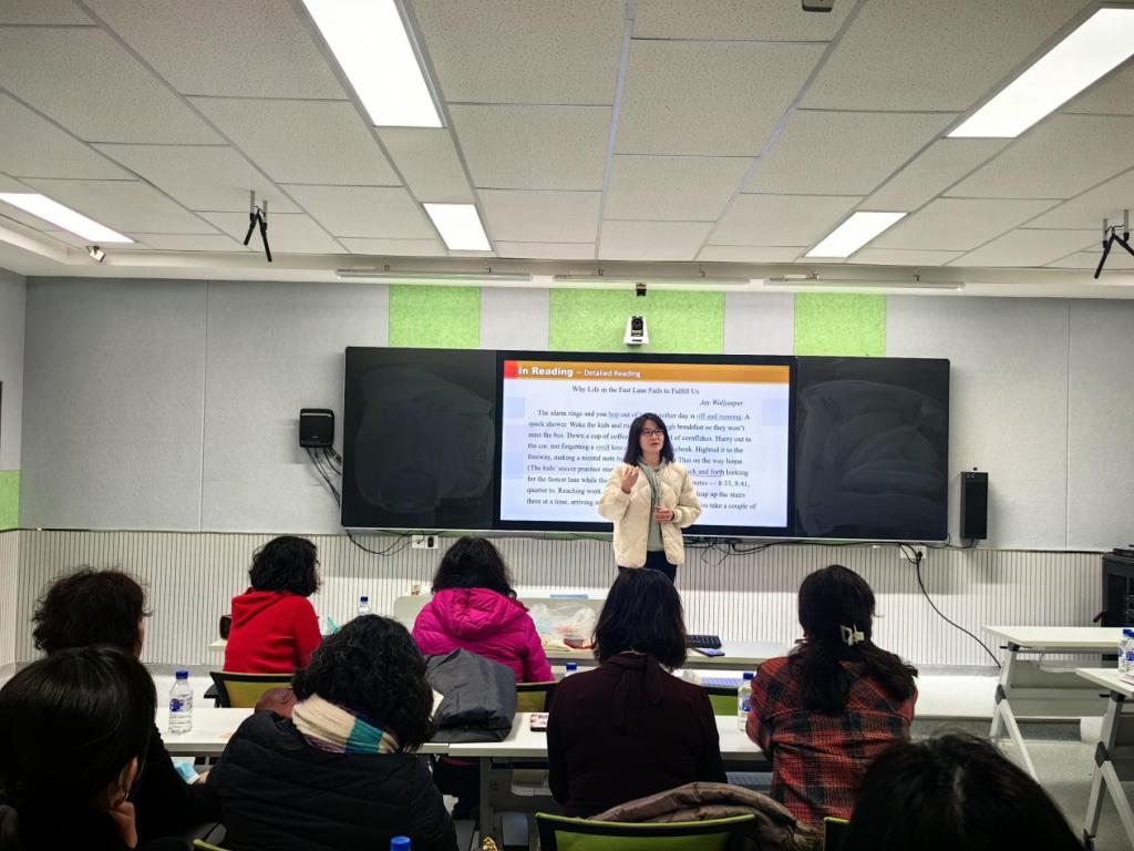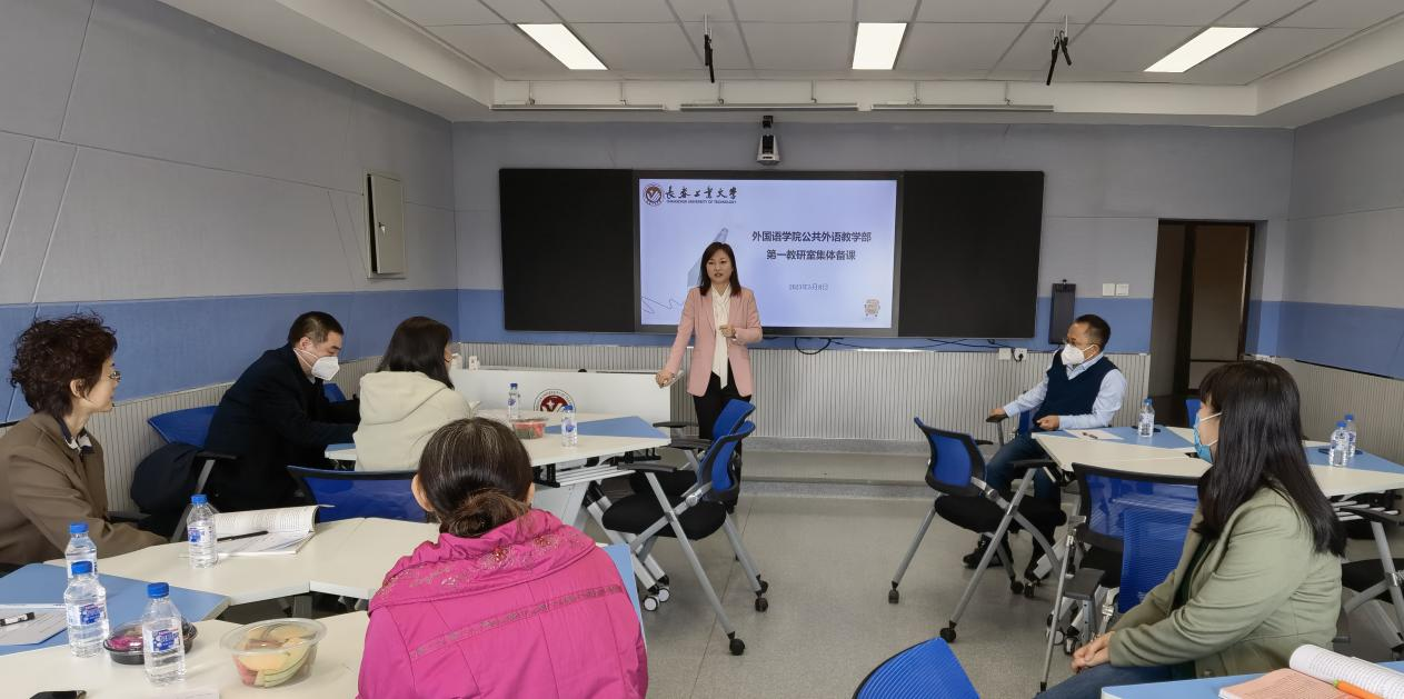第二教研室由公共外语教学部系副主任张羽华主讲,以《全新版大学高阶英语综合教程》第四册第二单元为依托,针对本学期不同单元教学设计及教学思路进行了详细展示。提出将文章内容与四、六级考试各题型有机融合,针对性地讲解词汇和处理篇章。此外,教师们就“后疫情时期”如何组织课堂教学展开讨论,对于教学重难点的处理以及如何科学分配学时各抒己见,对说课内容进行询问补充,交流心得。