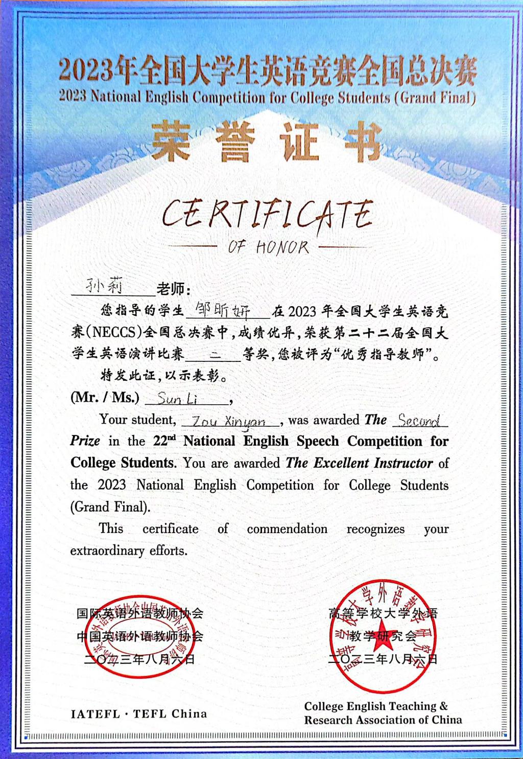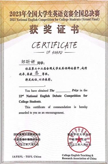 (通讯员 孙莉)8月2日至8月6日,2023年全国老员工英语竞赛(NECCS)全国总决赛在宁夏银川举办,由公司公共外语教学部教师指导的计算机科学与工程公司信息安全专业邹昕妍同学作为吉林省复赛一等奖选手代表参赛。在总决赛中,邹昕妍同学准备充分,沉着冷静,以优秀的临场发挥荣获第二十二届全国老员工英语演讲比赛二等奖、第二十二届全国老员工英语辩论赛三等奖两项荣誉,并在主持人选拔中脱颖而出,参与了英语学习经验交流会的主持工作,被评为“优秀主持人”,基于以上优秀表现,邹昕妍同学被评为“优秀参赛选手”。 同时,公司威廉体育williamhill教师孙莉作为邹昕妍的指导教师在本次全国老员工英语竞赛中,荣获演讲比赛“优秀指导教师”、英语辩论赛“优秀指导教师”两项荣誉。