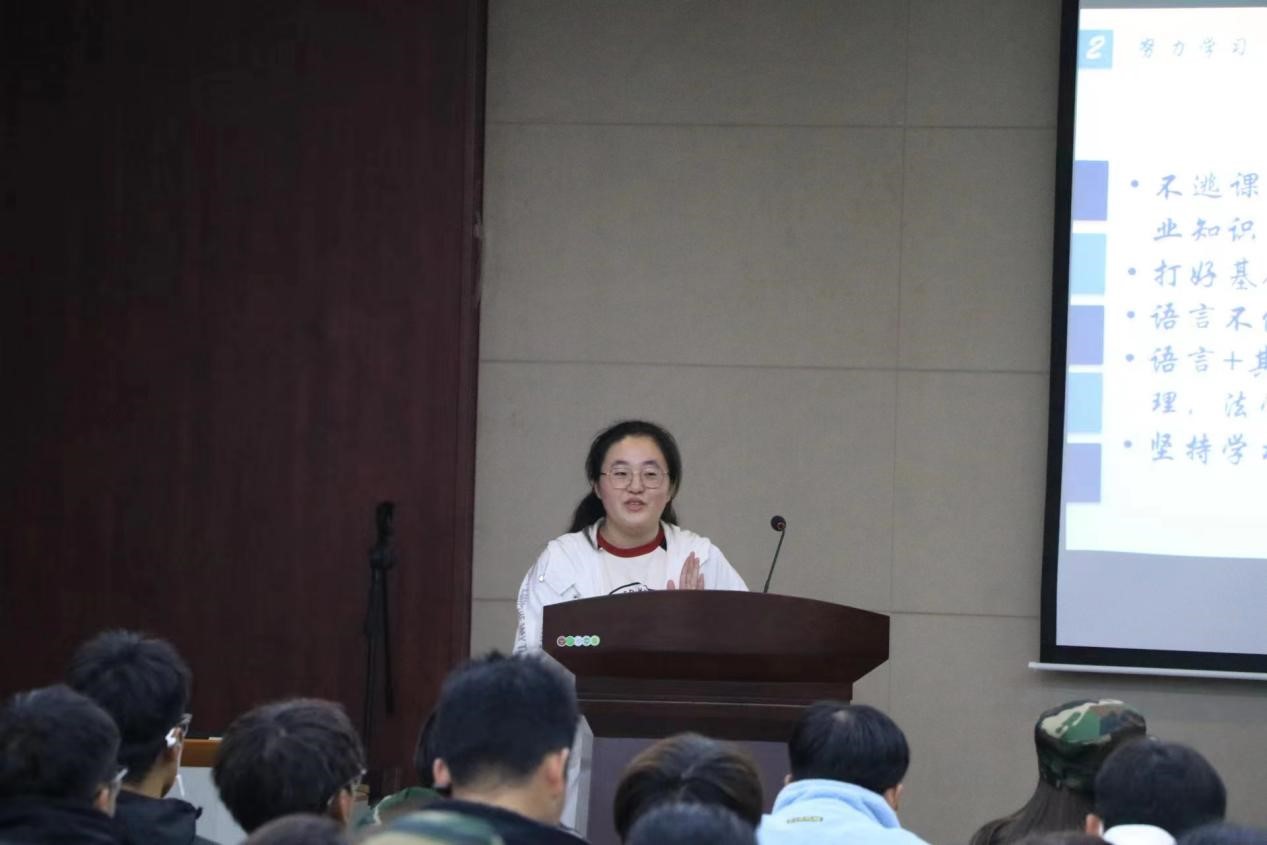 本网讯 (通讯员 张晓君 顾欣然)为了引导2023级新生充分了解老员工活、明确大学目标,拓展视野,树立外语学习思维。2023年10月25日公司在主楼435教室,邀请十佳老员工葛堃和自立自强老员工韦佳进行专题报告会,为新生分享经验。