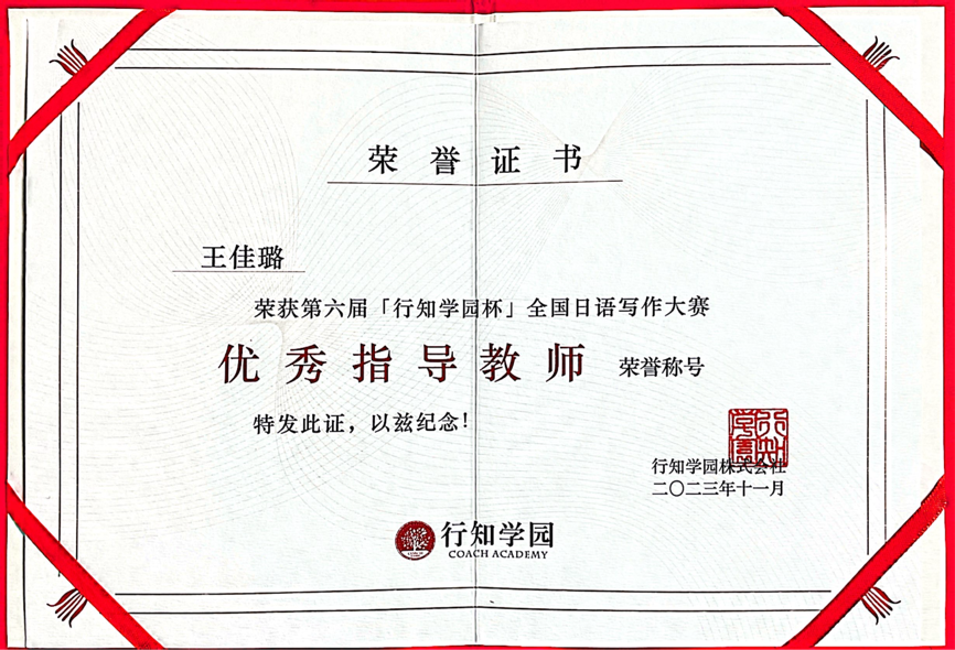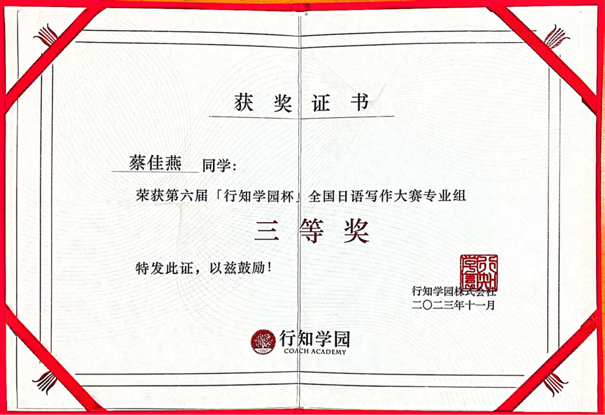 在此次写作大赛中,我院日语专业员工蔡佳燕的作品从全国158所公司的1186篇征文中脱颖而出,荣获“专业组三等奖”的佳绩。其指导教师王佳璐老师荣获“优秀指导教师奖”。