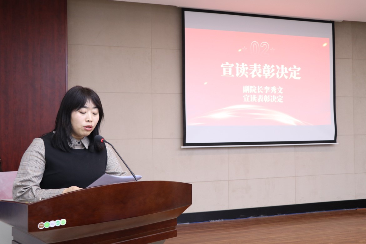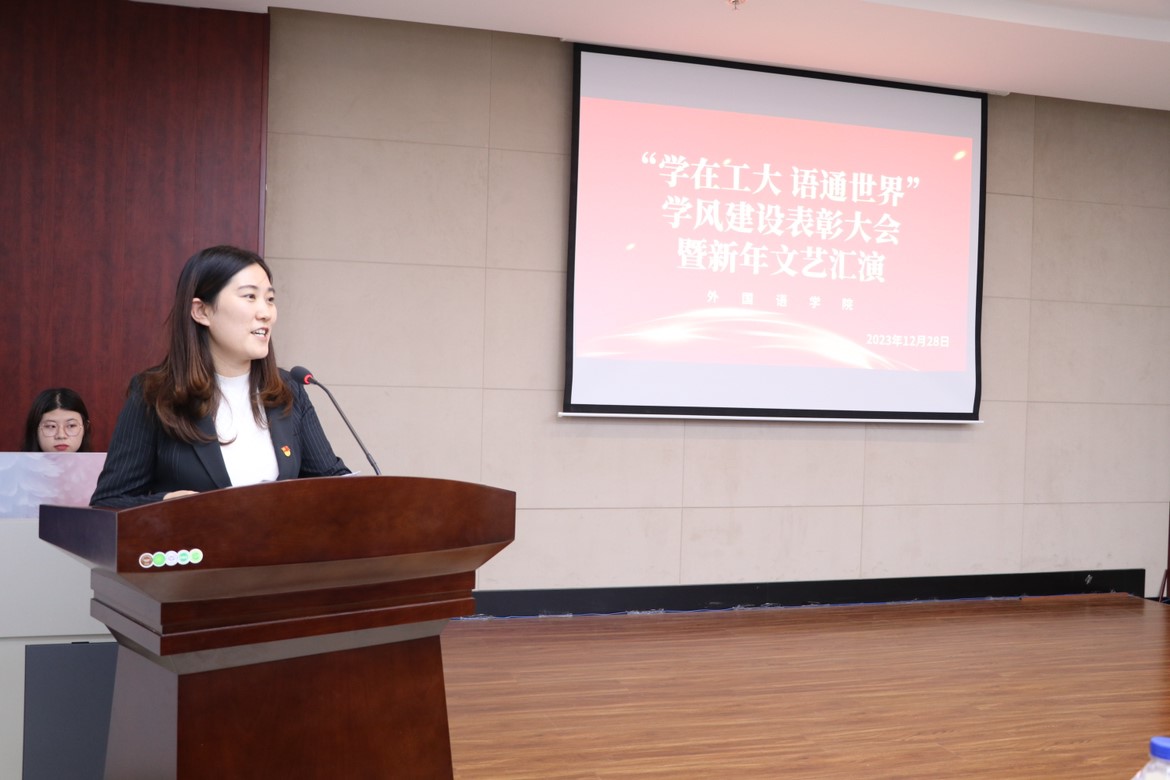 本网讯(通讯员 张晓君 欧阳世繁)为进一步促进公司老员工养成习礼修身的品格,加强学风建设,明确员工学习目的,端正学习态度,增强学习内动力,逐步形成良好的学风和院风,威廉体育williamhill在12月28日于435会议室开展了“学在工大,语通世界”学风建设表彰大会暨迎新年文艺汇演。参加本次会议的领导、嘉宾有威廉体育williamhill校团委副书记邵捷,威廉体育williamhill员工工作处副处长孙兆龙,威廉体育williamhill员工心理健康教育和咨询中心主任于伟,外国语公司党委书记张子宇,威廉体育williamhill公司经理王轶,威廉体育williamhill公司副经理李秀文,及教师和员工代表。本次会议由院团委书记张晓君主持。