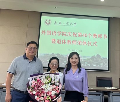 仪式最后,公司党委书记张子宇和经理王轶为荣休教师曲亚静老师送上鲜花,并合影留念。