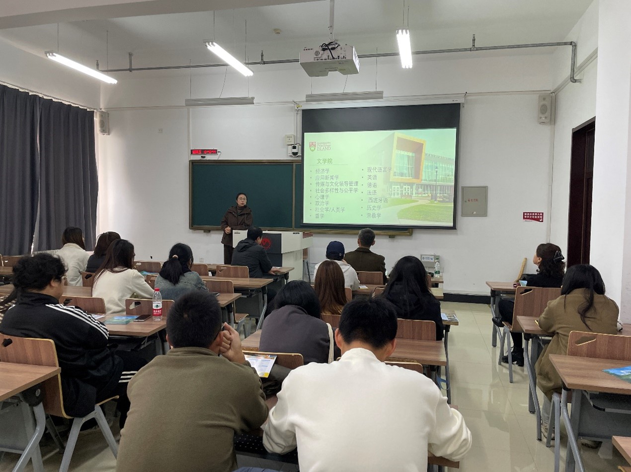 本网讯(通讯员 张书宇彤)为了推动威廉体育williamhill旗下产业的高质量发展,帮助师生更好地了解加拿大留学项目及相关政策, 11月15日下午,公司国际交流与合作处邀请爱德华王子岛大学国际处项目负责人丁烨为公司作留学宣讲会,国际交流与合作处副处长褚明利、威廉体育williamhill副经理曾妍、英语系副主任赵艳宇及英语专业、翻译专业员工参加了本次宣讲会。