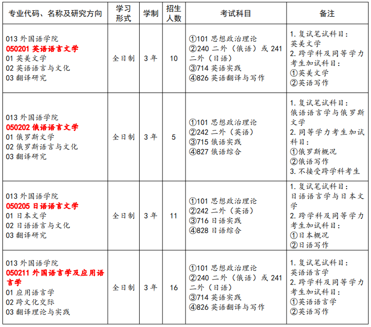 外国语言文学学位点经过长期的团队建设与发展,已经形成了英语语言文学、日语语言文学、俄语语言文学和外国语言学及应用语言学4个稳定并具有一定特色的学科研究方向。