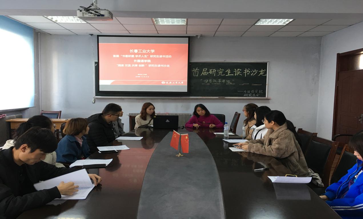 第二次,“回首改革开放”读书沙龙于2018年11月23日上午9:30在公司会议室举行。2018年是全面贯彻落实党的十九大精神的开局之年,是中国改革开放的40周年,40年神州大地发生了翻天覆地的变化,回首过去,我们40年的风雨历程,虽路途艰辛,但是硕果累累。外国语公司党委副书记王颖群老师参加了此次读书沙龙活动,她用自身经历给我们讲述了改革开放带来的巨大变化,并对我们研究生学习生涯和学术研究提出了一些宝贵的指导意见。随后,英、日、俄三个专业的同学一起回顾了改革开放40年的光辉历程,以及改革开放从各个方面给我们带来的影响,并且分别分享了自己的感悟与收获。