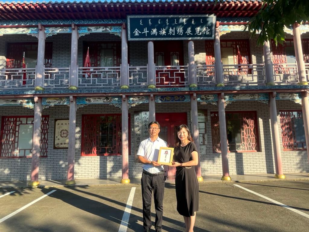 金斗小学董事长李龙向经理王轶赠送满绣作品