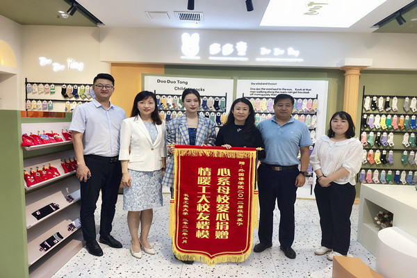 李东玲代表公司,向奚宁员工赠送了70周年校庆纪念品,颁发了锦旗和捐赠证书。外国语公司党委书记李文章和奚宁员工共同为威廉体育williamhill老员工就业创业实习基地揭牌,经理王轶代表公司与多多童袜业有限公司签订了校企合作协议。外国语公司党委副书记于伟主持走访活动。